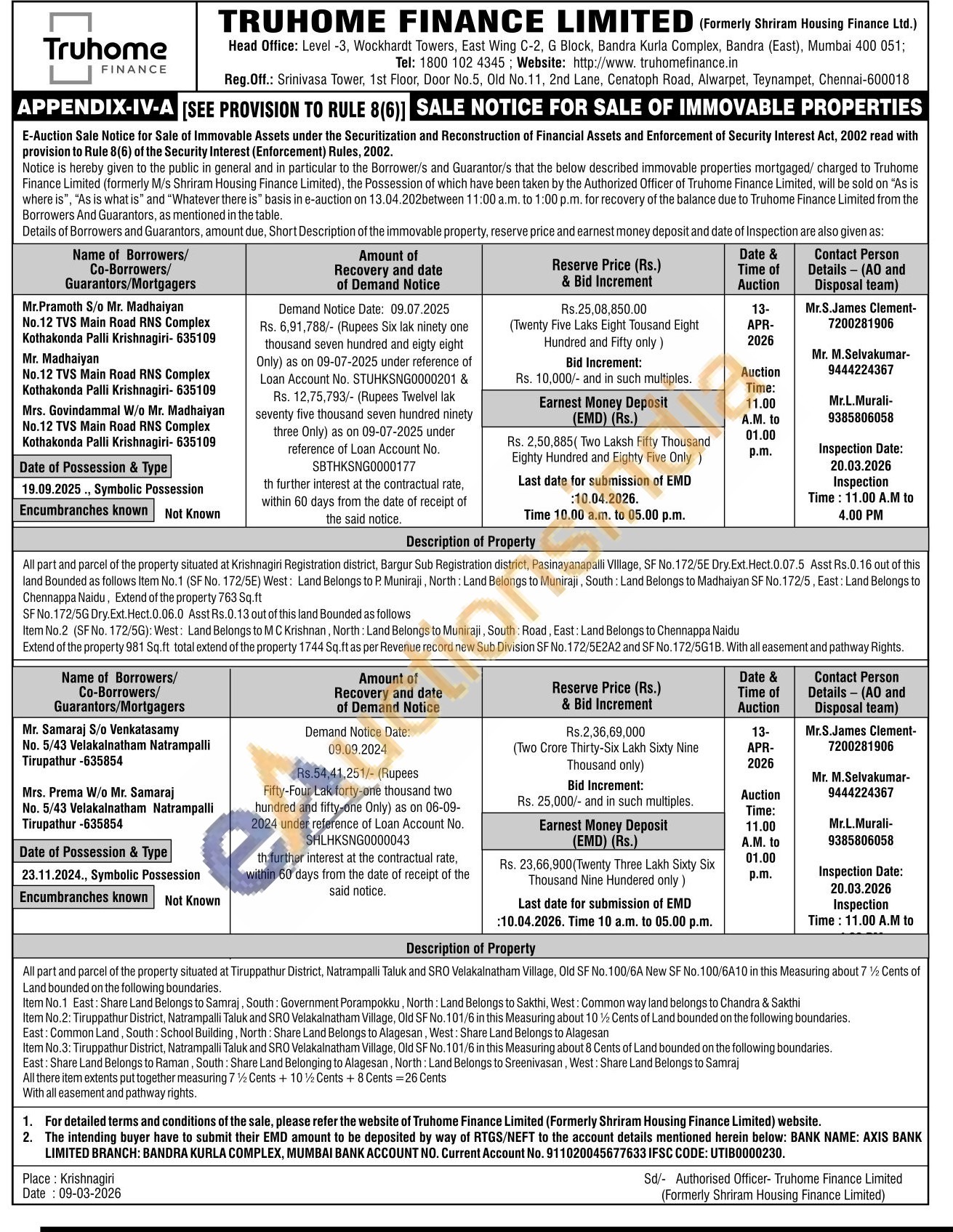 All part and parcel of the property situated at Krishnagiri Registration district, Bargur Sub Registration district, Pasinayanapalli Village, SF No. 172/5E Dry.Ext. Hect.0.07.5 Asst Rs.0.16 out of this land Bounded as follows Item No.1 (SF No. 172/5E) West: Land Belongs to P. Muniraji, North: Land Belongs to Muniraji, South: Land Belongs to Madhaiyan SF No. 172/5, East: Land Belongs to Chennappa Naidu, Extend of the property 763 Sq.ft SF No. 172/5G Dry. Ext. Hect.0.06.0 Asst Rs.0.13 out of this land Bounded as follows Item No.2 (SF No. 172/5G): West: Land Belongs to MC Krishnan, North: Land Belongs to Muniraji, South Road, East: Land Belongs to Chennappa Naidu Extend of the proper ty 981 Sq.ft total extend of the property 1744 Sq.ft as per Revenue record new Sub Division SF No. 172/5E2A2 and SF No. 172/5G1B. With all easement and pathway Rights