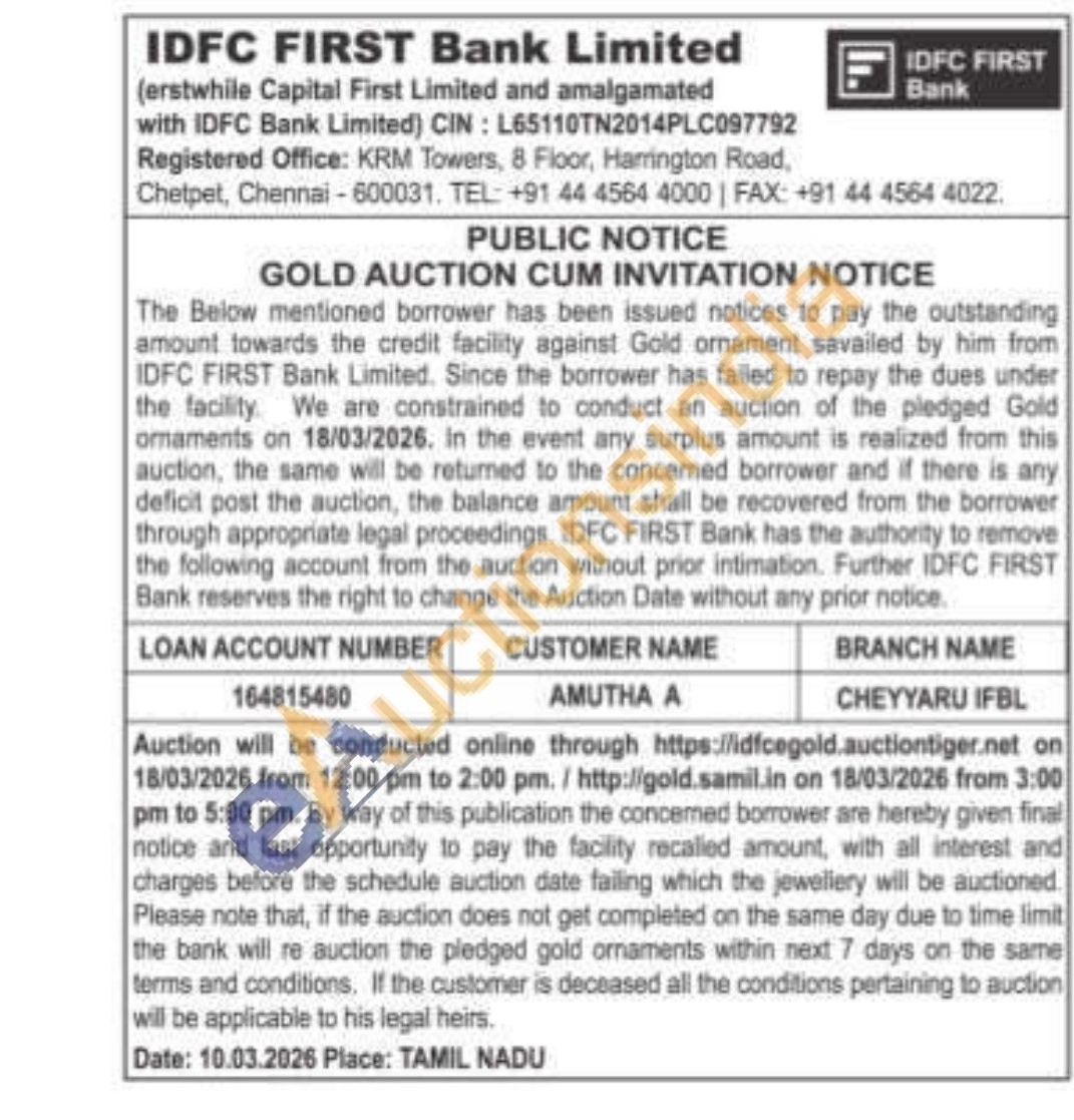 IDFC First Bank Ltd Gold Auctions Auction in Chennai