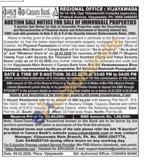 A Vacant Residential site to an extent of 260 sq.yds with bearing Plot No.57, R.S No. 143/2, near Door No. 5-73 situated in Akunuru Village, Vuyyuru Mandal and within the limits of S.R.O Vuyyuru of Krishna District, within the following boundaries. East: Plot No.20, South: Plot No 58, West: 33 Feet wide Road, North: Plot No.56