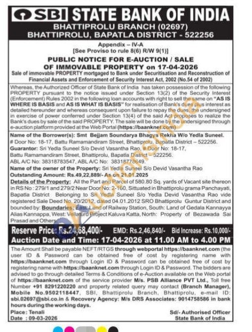 Details of the Property: All the Part and Parcel of 580.80 Sq. yards of Vacant site thereon in RS No: 279/1 and 279/2 Near Door No: 2-160, Sittuated in Bhattiprolu grama Panchayati, Bapatla District Belonging to Sri Yedia Suneel Sio Yedia Devid Vasantha Rao vide registered Sale Deed No. 20/2012, dated 04.01.2012 SRO Bhattiprolu Guntur District and bounded by: Boundaries: East: Land of Railway Station, South: Land of Gedala Kannayya Alias Kannappa, West: Vellaturu Project Kaluva Katta, North: Property of Bezawada Sai Prasad and Others.