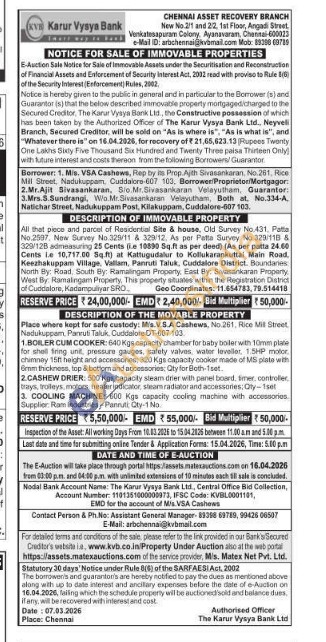 trays, trolleys, motors, heater indicator, steam radiator and accessories, Qty-1set 3. COOLING MACHINE: 600 Kgs capacity cooling machine with accessories Supplier Ram Industries-Panruti; Qty-1 No.