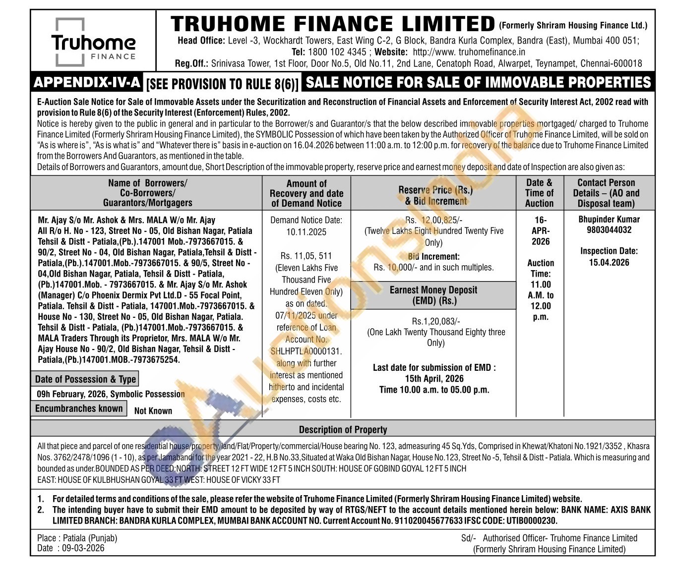 All that piece and parcel of one residential house/ property/ land/ Flat/ Property/ commercial/ House bearing No. 123, admeasuring 45 Sq. Yds, Comprised in Khewat/Khatoni No. 1921/3352, Khasra Nos. 3762/2478/1096 (1-10), as per Jamabandi for the year 2021-22, H.B No.33, Situated at Waka Old Bishan Nagar, House No. 123, Street No-5, Tehsil & Distt - Patiala. Which is measuring and bounded as under. BOUNDED AS PER DEED: NORTH: STREET 12 FT WIDE 12 FT 5 INCH SOUTH: HOUSE OF GOBIND GOYAL 12 FT 5 INCH EAST: HOUSE OF KULBHUSHAN GOYAL 33 FT WEST: HOUSE OF VICKY 33 FT