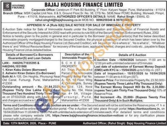 SCHEDULE PROPERTY : All That Piece and Parcel of the Immovable Property Being Flat No. A-105, 1st Floor, Wing A, Om Heights, Survey - No Old. 128. New Survey No. 154, Hissa No. 4+ 5A. Village-Fursungi, Pune. Maharashtra-412308