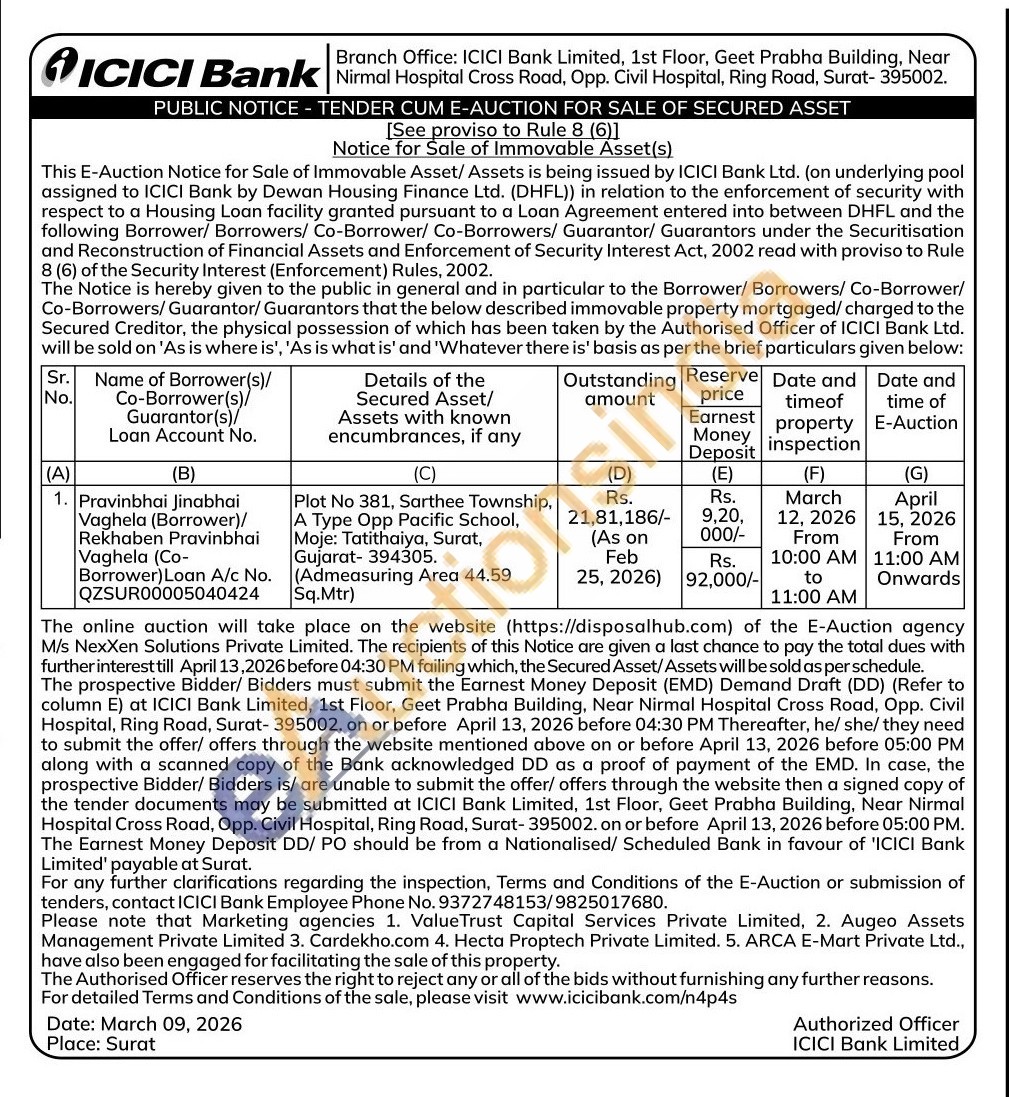 Plot No 381, Sarthee Township, A Type Opp Pacific School, Moje: Tatithaiya, Surat, Gujarat-394305. (Admeasuring Area 44.59 Sq.Mtr)