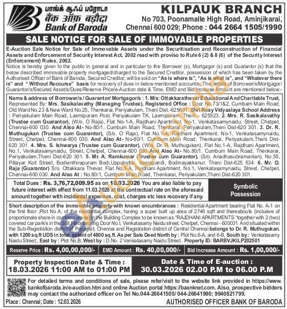 Short description of the immovable property with known encumbrances: Residential Apartment bearing Flat No. A-1 on the first floor Plot No A, of the residential complex, having a super built up area of 2746 sqft and thereabouts (inclusive of proportionate share in common areas) in the Building Complex to be known as "RAJDHANI APARTMENTS "Together with 2 (two) covered car park's in the Stilt Floor bearing Door No.I, Venkatasamy Naidu street, Chetpet, Chennai-600031 And situated within the Sub-Registration district of Periamet, Chennai and Registration district of Central Chennai belongs to Dr. R. Muthugukan. with 1200 sq.ft UDS in total extent of 4800 sq.ft. As per Sale Deed North by: Plot No.6-A, and 6-B, South by: Venkalasamy Naidu Street, East by: Plot No.B, West by: D.No. 2 Venkatasamy Naidu Street Property ID: BARBVJKILP202501