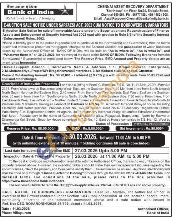 2351, From West towards East measuring West-East on the Southern side: 4.40 Mtr, from there from South towards North South-North on the Eastern Side: 2.40 metre, From there from West towards East West-East on the Southern side: 30 metre, from there from South towards North, South-North on the Eastern Side: 7.30 metre, From there, From East towards West: East-West on the Northern Side: 3.10 metre, From there, From North towards South North-South, till Western side. 9.80 metre, having an extent of 38 Cantiars or 409 Sq. Ft.. A plot with terraced storeyed house. Including Electricity and Water services. Previous Door No. 143. At present Door No 67 Puducherry Registration District, Puducherry Sub-Registration District, Village No. 40. Pududcherry Revenue Village situated at Easwaran Dharmaraja Koil Street, Pududcherry in the name of Guarantor Mr Madurai alias. Rajagopal, Boundaries: North by Easwaran Dharmaraja Koil Street, -South by House comprised in T.S. No. 10, East by House comprised in T.S. No. 12, West by Arina Salai