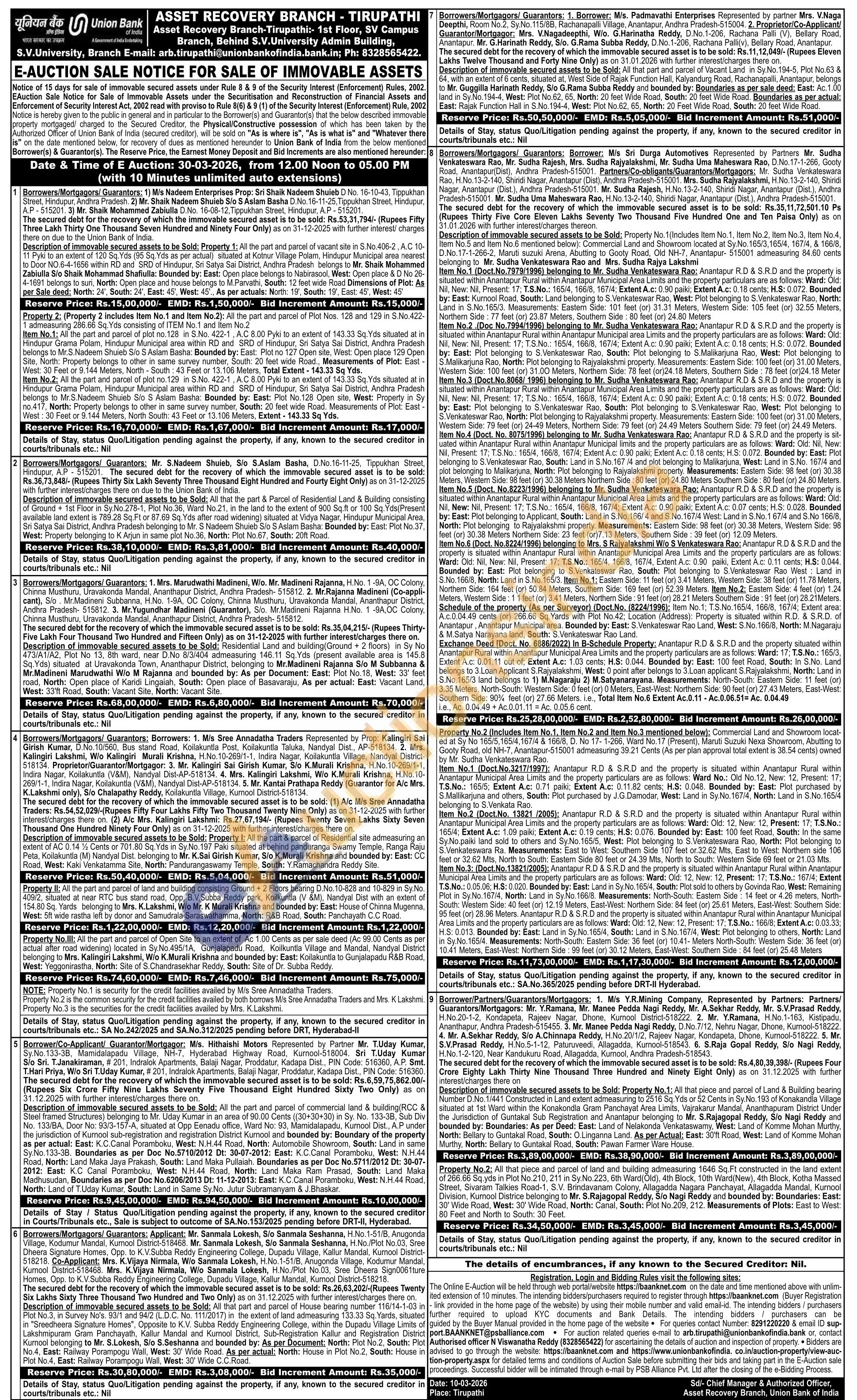 Property II; All the part and parcel of land and building consisting Ground + 2 Floors bearing D.No.10-828 and 10-829 in Sy.No. 409/2, situated at near RTC bus stand road, Opp. B.V.Subba Reddy park, Koilkuntla (V &M), Nandyal Dist with an extent of 154.80 Sq. Yards belonging to Mrs. K.Lakshmi, W/o Mr. K Murali Krishna and bounded by: East: House of Chinna Mugenna, West: 5ft wide rastha left by donor and Samudrala Saraswathamma, North: R&B Road, South: Panchayath C.C Road.