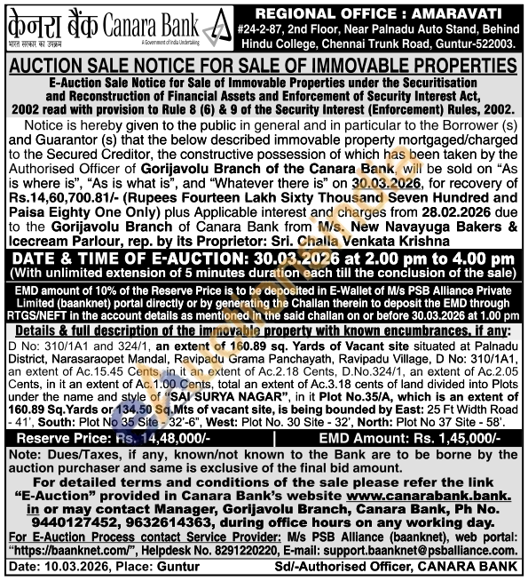 Details & full description of the immovable property with known encumbrances, if any: D No: 310/1A1 and 324/1, an extent of 160.89 sq. Yards of Vacant site situated at Palnadu District, Narasaraopet Mandal, Ravipadu Grama Panchayath, Ravipadu Village, D No: 310/1A1, an extent of Ac. 15.45 Cents, in it an extent of Ac.2.18 Cents, D.No.324/1, an extent of Ac.2.05 Cents, in it an extent of Ac. 1.00 Cents, total an extent of Ac.3.18 cents of land divided into Plots under the name and style of "SAI SURYA NAGAR", in it Plot No.35/A, which is an extent of 160.89 Sq. Yards or 134.50 Sq.Mts of vacant site, is being bounded by East: 25 Ft Width Road -41', South: Plot No 35 Site 32'-6", West: Plot No. 30 Site 32', North: Plot No 37 Site - 58'