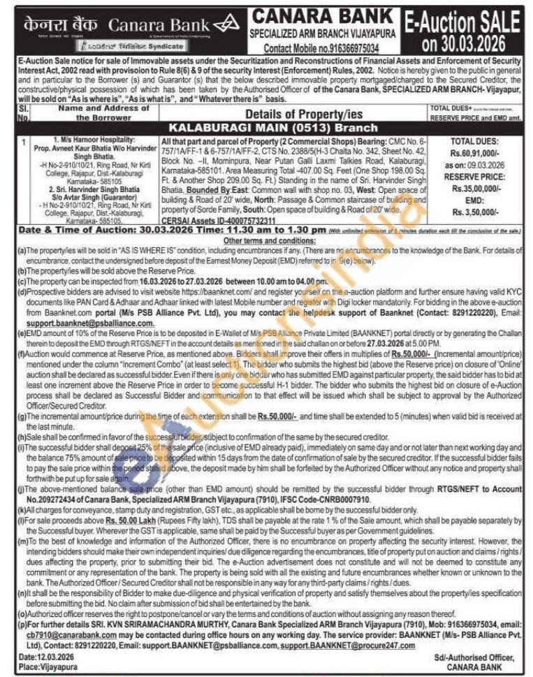 All that part and parcel of Property (2 Commercial Shops) Bearing: CMC No. 6-757/1A/FF-186-757/1A/FF-2, CTS No. 2388/5(H-3 Chaita No. 342, Sheet No. 42, Block No. -II, Mominpura, Near Putan Galli Laxmi Talkies Road, Kalaburagi, Karnataka-585101. Area Measuring Total -407.00 Sq. Feet (One Shop 198.00 Sq. FL. & Another Shop 209.00 Sq. Ft.) Standing in the name of Sri. Harvinder Singh Bhatia, Bounded By: East Common wall with shop no. 03, West: Open space of building & Road of 20 wide, North: Passage & Common staircase of building and property of Sorde Family, South: Open space of building & Road of 20' wide.