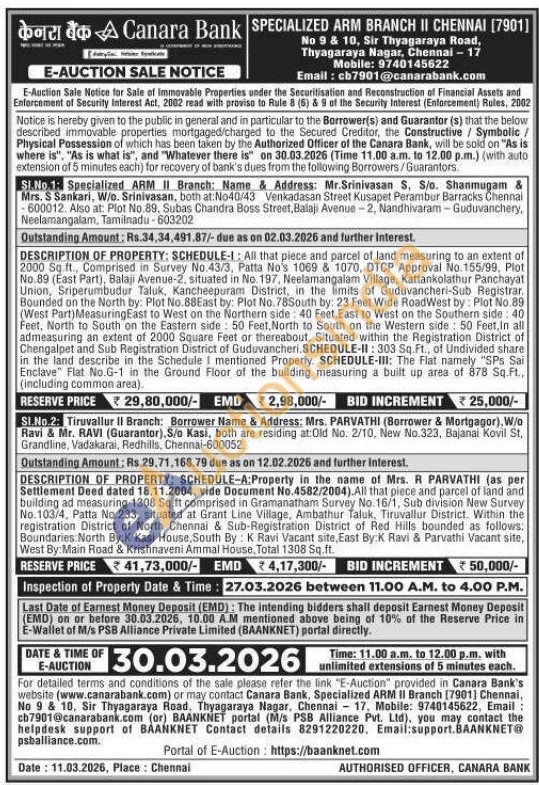 DESCRIPTION OF PROPERTY: SCHEDULE-A: Property in the name of Mrs. R PARVATHI (as per Settlement Deed dated 18.11.2004, vide Document No.4582/2004). All that piece and parcel of land and building ad measuring 1308 Sq.ft comprised in Gramanatham Survey No. 16/1, Sub division New Survey No.103/4, Patta No.233, situated at Grant Line Village, Ambathur Taluk, Tiruvallur District. Within the registration District of North Chennai & Sub-Registration District of Red Hills bounded as follows: Boundaries North By:K Kasi House, South By: K Ravi Vacant site, East By:K Ravi & Parvathi Vacant site, West By:Main Road & Krishnaveni Ammal House, Total 1308 Sq.ft