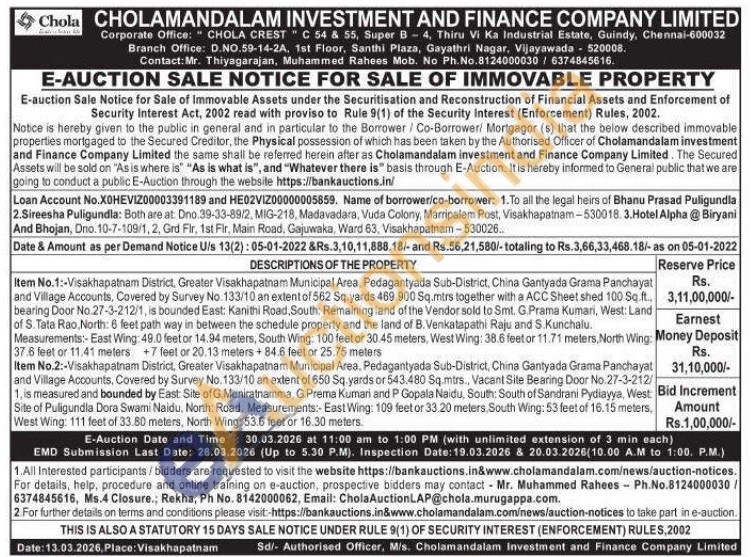 Item No.2:-Visakhapatnam District, Greater Visakhapatnam Municipal Area. Pedagantyada Sub-District, China Gantyada Grama Panchayat and Village Accounts, Covered by Survey No. 133/10 an extent of 650 Sq yards or 543.480 Sq.mtrs., Vacant Site Bearing Door No. 27-3-212/1, is measured and bounded by East: Site of G.Muniratnamma, G.Prema Kumari and P Gopala Naidu, South: South of Sandrani Pydiayya, West: Site of Puligundla Dora Swami Naidu, North: Road. Measurements:- East Wing: 109 feet or 33.20 meters, South Wing: 53 feet of 16.15 meters. West Wing: 111 feet of 33.80 meters, North Wing: 53.6 feet or 16.30 meters