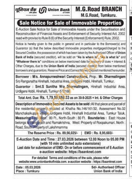 Description of Immovable Secured Assets to be sold : All that piece and parcel of the residential property situated at Khatha No.146/161/32, Assessment No.32 Manchakalkuppe village, Urdigere Hobli, Hirehalli Industrial Area, Tumkur Taluk, Measuring East-West: 80 Ft., North-South: 80 Ft. Boundaries: East: House belongs to Ranganath and Ramakrishna, West: Property of Roopakumari, North: Road, South: Property of Lakshmamma