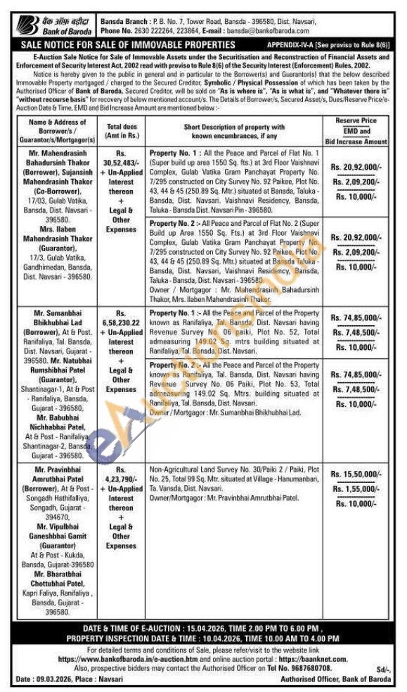 All Peace and Parcel of Flat No. 2 (Super Build up Area 1550 Sq. Fts.) at 3rd Floor Vaishnavi Complex, Gulab Vatika Gram Panchayat Property No. 7/295 constructed on City Survey No. 92 Paikee, Plot No. 43, 44 & 45 (250.89 Sq. Mtr.) situated at Bansda Taluka Bansda, Dist. Navsari, Vaishnavi Residency, Bansda, Taluka Bansda, Dist. Navsari-396580. Owner/ Mortgagor Mr. Mahendrasinh Bahadursinh Thakor, Mrs. Ilaben Mahendrasinh Thakor