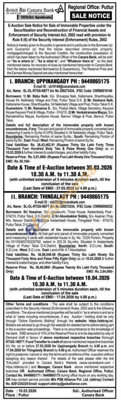 Details and full description of the immovable property with known encumbrances, if any. The part and parcel of immovable property converted land measuring 5 cents in Sy.No.41/(P9) Situated in 34 Nekkilady village, Puttur Taluk Boundaries: Remaining Portion of same Sy.No.; South: Remaining Portion of same Sy.No.; East: Road, West: Remaining Portion of same Sy.No