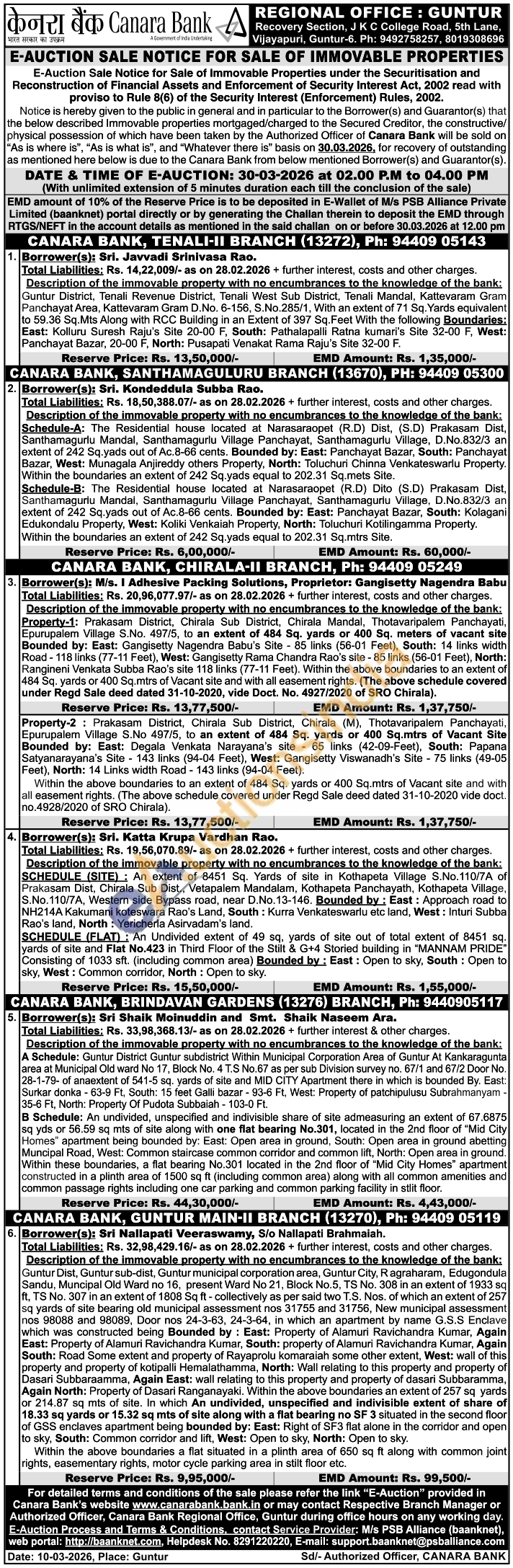 Description of the immovable property with no encumbrances to the knowledge of the bank: SCHEDULE (SITE): An extent of 8451 Sq. Yards of site in Kothapeta Village S.No.110/7A of Prakasam Dist, Chirala Sub Dist., Vetapalem Mandalam, Kothapeta Panchayath, Kothapeta Village, S.No.110/7A, Western side Bypass road, near D.No.13-146. Bounded by: East: Approach road to NH214A Kakumani koteswara Rao's Land, South: Kurra Venkateswarlu etc land, West: Inturi Subba Rao's land, North: Yericherla Asirvadam's land.