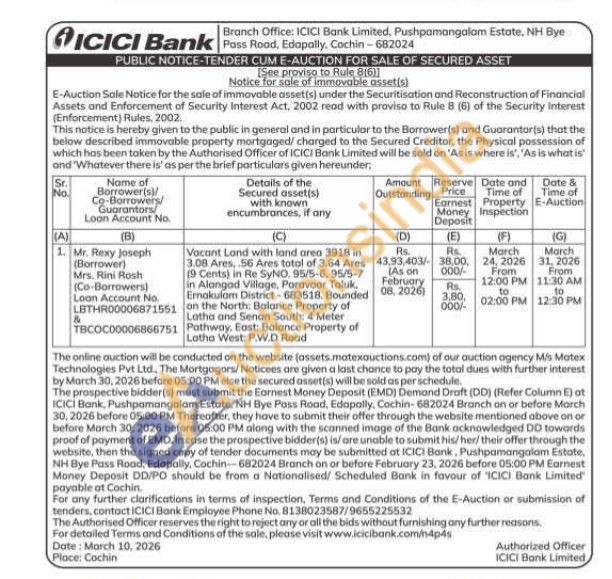 Vacant Land with land area 3918 in 3.08 Ares, 56 Ares total of 3.64 Ares (9 Cents) in Re SyNO. 95/5-6,95/5-7 in Alangad Village, Paravoor Taluk, Ernakulam District-683518. Bounded on the North: Balance Property of Lotha and Senan South: 4 Meter Lotho West: P.W.D Road Pathway, East: Balance Property of