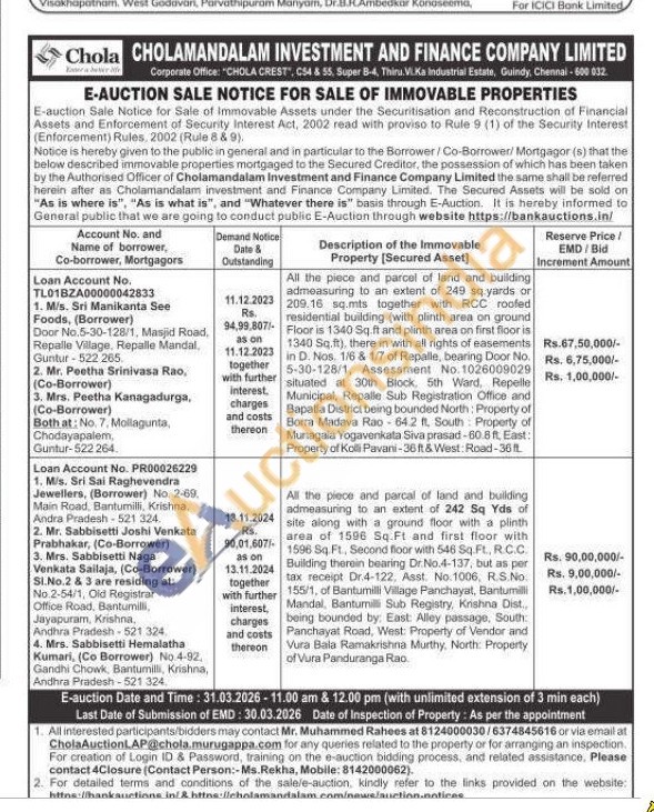 All the piece and parcel of land and building admeasuring to an extent of 249 sq yards or 209.16 sq.mts together with RCC roofed residential building (with plinth area on ground Floor is 1340 Sq ft and plinth area on first floor is 1340 Sq.ft), there in with all rights of easements in D. Nos. 1/6 & 1/7 of Repalle, bearing Door No. 5-30-128/1, Assessment No. 1026009029 situated at 30th Block, 5th Ward, Repelle Municipal, Repalle Sub Registration Office and Bapatlla District being bounded North: Property of Borra Madava Rao-64.2 ft. South Property of Murnagala Yogavenkata Siva prasad-60 Bft East: Property of Kolli Pavani-36 ft & West: Road-36