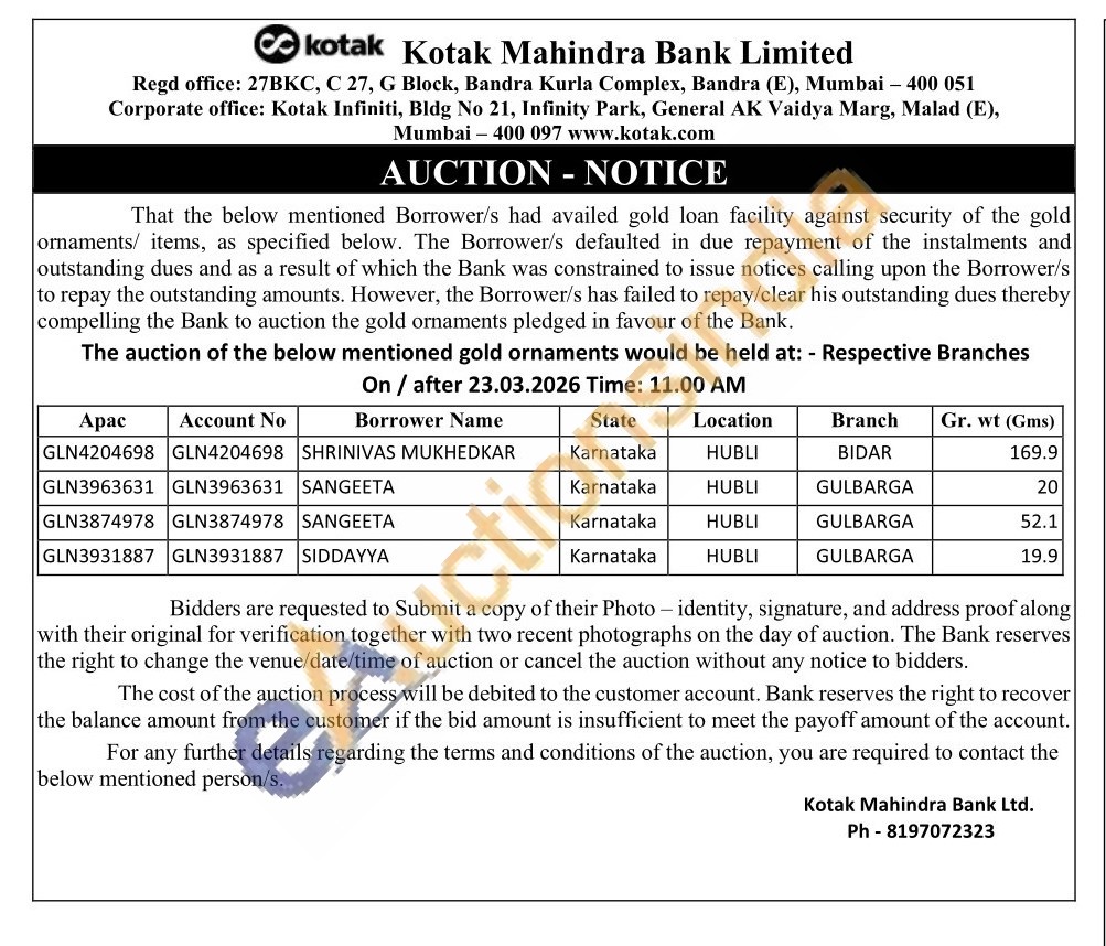 Kotak Mahindra Bank Gold Auctions Auction in Hubballi