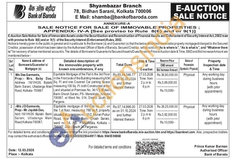 Equitable mortgage of the Flat no. C1, on the 1 st floor, measuring 769 sq.ft. property situated at, premises no, 16/2, Murari Pukur Road, now Biplabi Barin Ghosh Sarani, ward no. 14, P.S. Maniktala, Kolkata 700067, Dist-South 24 Parganas.