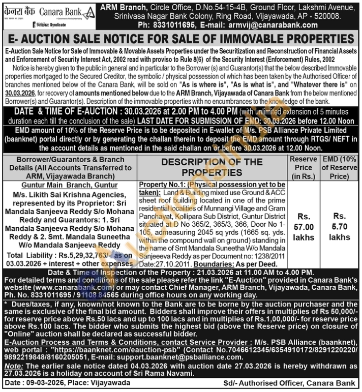Property No.1: (Physical possession yet to be taken): Land & Building mixed use Ground & ACC sheet roof building located in one of the prime residential localities of Munnangi Village and Gram Panchayat, Kollipara Sub District, Guntur District situated at D No 365/2, 365/3, 366, Door No 1-105, admeasuring 2045 sq yrds (1665 sq. yds. within the compound wall on ground) standing in the name of Smt Mandala Suneetha W/o Mandala Sanjeeeva Reddy as per Document no: 1238/2011 Date:27.10.2011. Boundaries: As per Deed