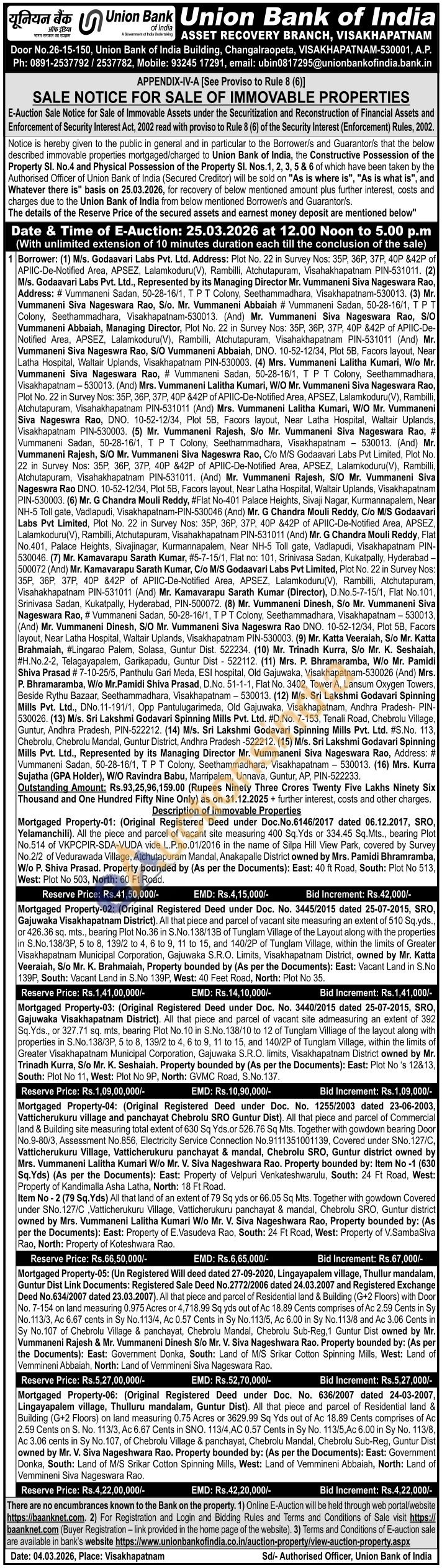 Mortgaged Property-01: (Original Registered Deed under Doc. No.6146/2017 dated 06.12.2017, SRO, Yelamanchili). All the piece and parcel of vacant site measuring 400 Sq. Yds or 334.45 Sq.Mts., bearing Plot No.514 of VKPCPIR-SDA-VUDA vide L.P.no.01/2016 in the name of Silpa Hill View Park, covered by Survey No.2/2 of Vedurawada Village, Atchutapuram Mandal, Anakapalle District owned by Mrs. Pamidi Bhramramba, W/o P. Shiva Prasad. Property bounded by (As per the Documents): East: 40 ft Road, South: Plot No 513, West: Plot No 503, North: 60 Ft Road