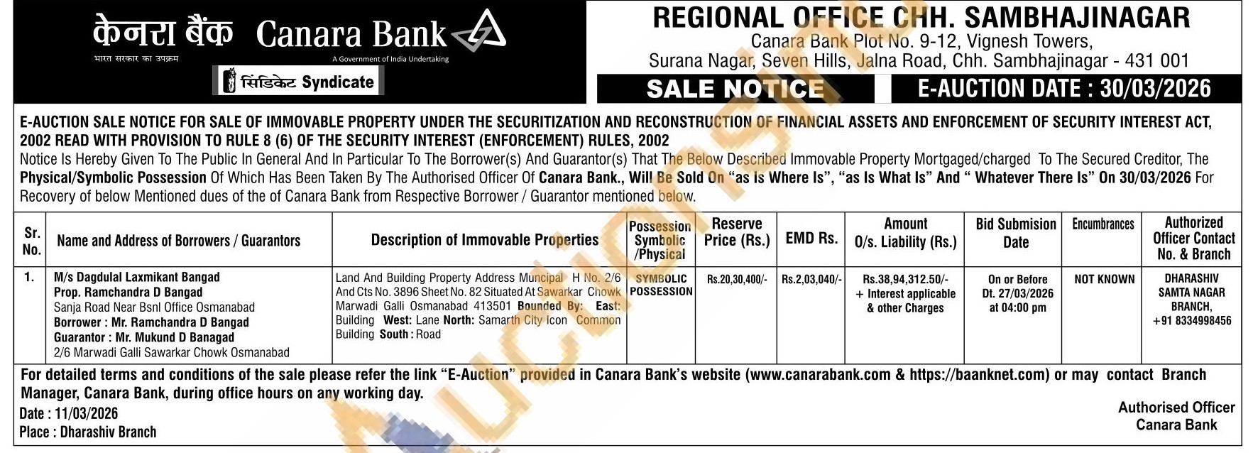 Land And Building Property Address Muncipal H No. 2/6 And Cts No. 3896 Sheet No. 82 Situated At Sawarkar Chowk Marwadi Galli Osmanabad 413501 Bounded By: East: Building West: Lane North: Samarth City Icon Common Building South: Road