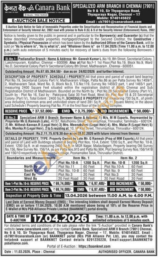DESCRIPTION OF PROPERTY: SCHEDULE I PROPERTY: All that piece and parcel of vacant land bearing Plot No. 19, Secretariat Colony Part IV, Madhavaram Village, Patta No.86 as per Patta Survey No: 1459/1, 2. Madhavaram Taluk, Ward No. D, Block No.9, T.S. No:119, Survey No 1459/2 part, 1 and 1465/1 part, measuring 2400 Square Feet situated within the registration district of North Chennai and Sub Registration District of Madhavaram. Bounded on the North by: Plot No 20 Secretariat Colony (Part IV), South by: Plot No 16, East by Pakkiyaraj Salai 30 Feet Road, West by: Plot Nos 15 & 23 Secretariat Colony (Part IV). Total Extent: 2400 Sq.Ft., SCHEDULE II PROPERTY: Flat measuring 730 Sq.ft., of plinth area including common area and undivided share of land 281 Sq.ft., (26.11 Square Metre) in the above said Schedule I Property bearing Flat No. F1 in the first floor of the building complex