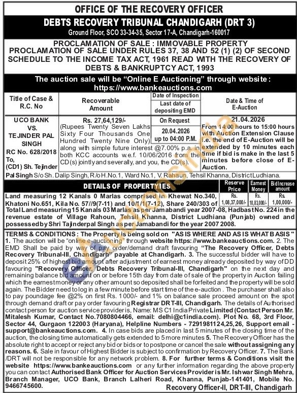 Land measuring 12 Kanals 0 Marlas comprised in Khewat No.340, Khatoni No.651, Kila No. 57//9(7-11) and 10/1/1(7-12), Share 240/303 of 1,08,37,000/- 10,83,000/- 1,00,000/-Total Land measuring 15 Kanals 03 Marlas as per Jamabandi year 2007-08, HadbastNo. 224 in the revenue estate of Village Rahoun, Tehsil Khanna, District Ludhiana (Punjab) owned and possessedby Shri Tajinderpal Singh as per Jamabandi for the year 2007 2008