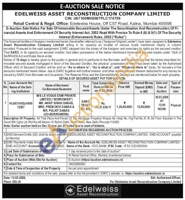 Note: Earlier auction held on Dec 25 and Jan 26' failed due to want of bidders.