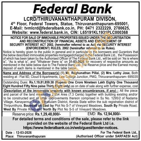 (Description of the immovable property with known. encumbrances. If any) : All the piece and parcel of the land measuring 2.954 Ares (7.3 Cents) together with building existing and/or to be constructed and all other improvements thereon comprised in Sy No. 1295/2 of Nadama Village, Kanayannur Taluk, Ernakulam District, Kerala State within the sub registration district of Thripunithura. Bounded on East by Plot No S-7 of Vineyard Meadows, South By Private Road, West By Private Road and North By Plot No S-5 of Vineyard Meadows