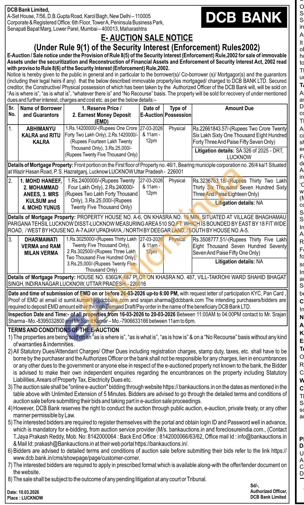 Details of Mortgage Property: Front portion on the First floor of Property no. 46/1, Bearing municiple corporation no. 26/4 ka/1 Situated at Wazir Hasan Road, P. S. Hazratganj, Lucknow LUCKNOW Uttar Pradesh-226001