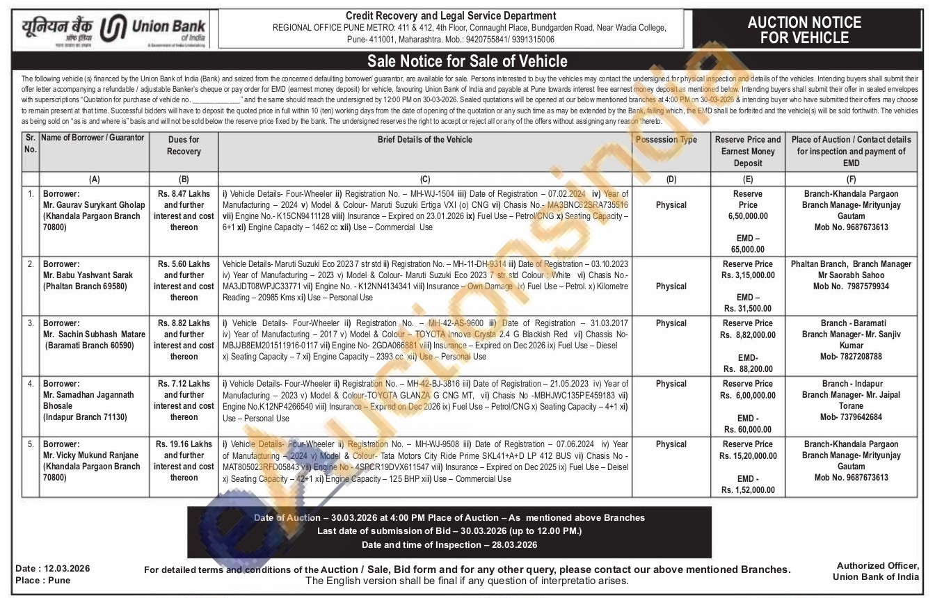 i) Vehicle Details-Four-Wheeler ) Registrabon No.-MH-42-BJ-3816 ii) Date of Registration-21.05.2023 iv) Year of Manufacturing-2023 v) Model & Colour-TOYOTA GLANZA G CNG MT, VI) Chasis No -MBHJWC135PE459183 vij Engine No.K12NP4266540 vil) Insurance-Expired on Dec 2026 ix) Fuel Use Petrol/CNG x) Seating Capacity-4+1 x) Use-Personal Use