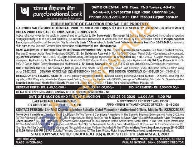 DETAILS OF THE SECURED ASSETS: All that property comprising double storeyed building bearing Municipal Number 1-2-583/17, covering 582 sq. yds or 500.92 sq. mts. situated at Gaganmahal Colony. Domalguda, Hyderabad-500029 belongs to Sni Balkishan Sio (Late) Sri Ghanshyamdas bounded as follows: North: Road South: Portion of Building No. 1-2-593-/17 East: 30 ft, wide road West: Plot No. 18