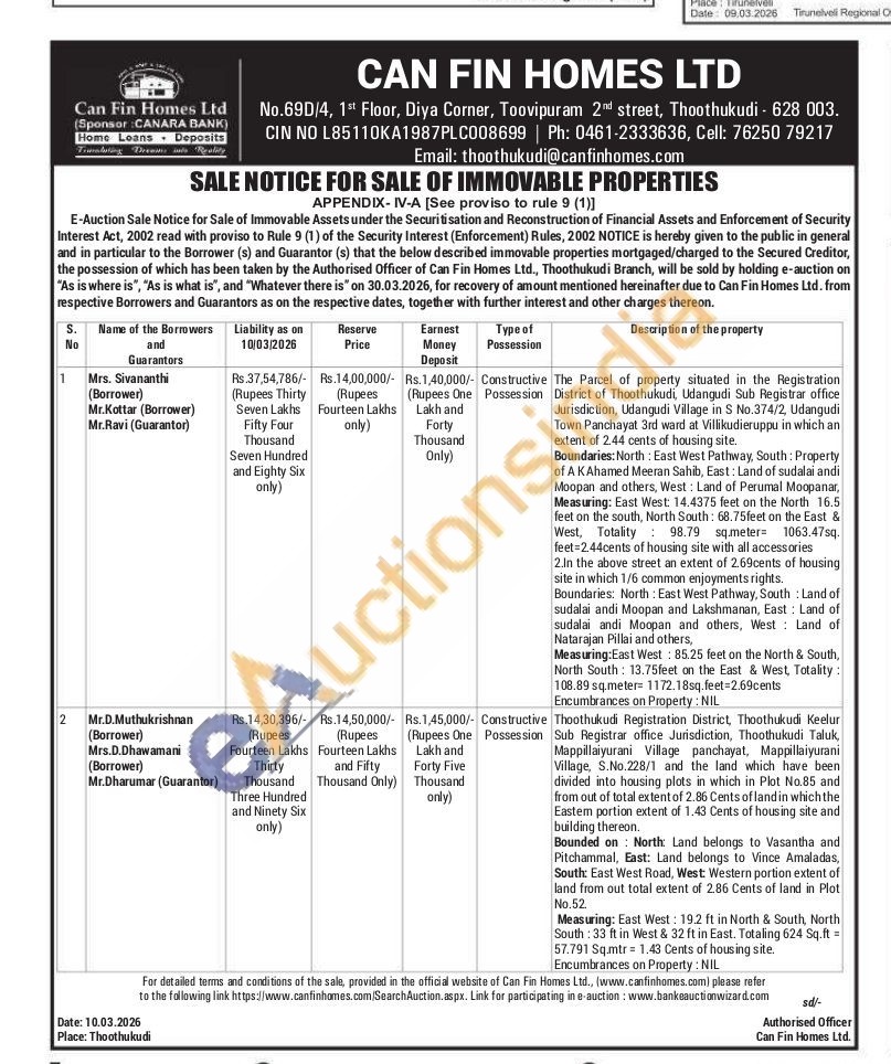 Thoothukudi Registration District, Thoothukudi Keelur Sub Registrar office Jurisdiction, Thoothukudi Taluk, Mappillaiyurani Village panchayat, Mappillaiyurani Village, S.No.228/1 and the land which have been divided into housing plots in which in Plot No.85 and from out of total extent of 2.86 Cents of land in which the Eastem portion extent of 1.43 Cents of housing site and building thereon. Bounded on: North: Land belongs to Vasantha and Pitchammal, East: Land belongs to Vince Amaladas, South: East West Road, West: Western portion extent of land from out total extent of 2.86 Cents of land in Plot No.52. Measuring: East West: 19.2 ft in North & South, North South: 33 ft in West & 32 ft in East. Totaling 624 Sq.ft = 57.791 Sq.mtr 1.43 Cents of housing site. Encumbrances on Property: NIL