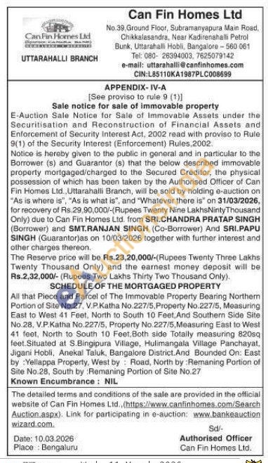All that Piece and Parcel of The Immovable Property Bearing Northern Portion of Site No.27, V.P.Katha No.227/5, Property No.227/5, Measuring East to West 41 Feet, North to South 10 Feet, And Southern Side Site No.28, V.P.Katha No.227/5, Property No. 227/5, Measuring East to West 41 feet, North to South 10 Feet, Both side Totally measuring 820sq feet Situated at S. Bingipura Village, Hulimangala Village Panchayat, Jigani Hobli, Anekal Taluk, Bangalore District. And Bounded On: East by: Yellappa Property, West by Road, North by Remaning Partion of Site No.28, South by : Remaning Portion of Site No.27