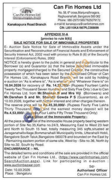 All the piece and parcel of the immovable House property bearing western portion of Site No.35, Katha no.24/3, Measuring East to West 23 feet and North to South 15 feet, totally measuring 345 sqfts, situated at Jaraganahallivillage, Bommanahalli Municipality limits, Uttarahalli Hobli, Bangalore South Taluk, Bangalore-560078 and bounded on the East by Remaining eastern portion of same site, West by-Site no.36, North by Site no.32, South by Road.