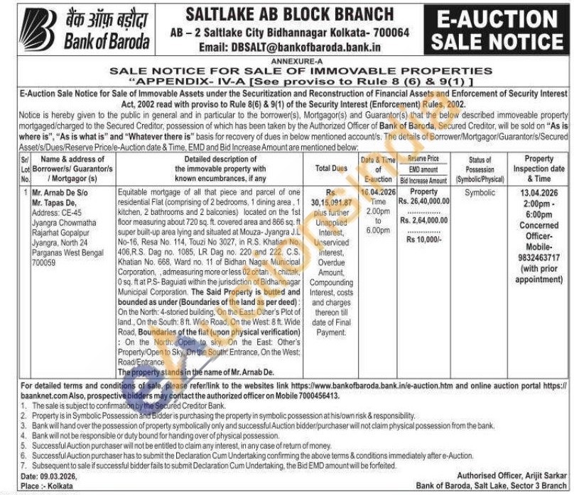 Equitable mortgage of all that piece and parcel of one residential Flat (comprising of 2 bedrooms, 1 dining area 1 kitchen, 2 bathrooms and 2 balconies) located on the 1st floor measuring about 720 sq. ft. covered area and 866 sq. ft super built-up area lying and situated at Mouza-Jyangra J.L No-16, Resa No. 114, Touzi No 3027, in R.S. Khatian No. 406,R.S. Dag no. 1085, LR Dag no. 220 and 222, C.S. Khatian No. 668, Ward no. 11 of Bidhan Nagar Municipal Corporation, admeasuring more or less 02 cotah, 1 chittak, 0 sq. ft at P.S-Baguiati within the jurisdiction of Bidhannagar Municipal Corporation. The Said Property is butted and bounded as under (Boundaries of the land as per deed) On the North: 4-storied building. On the East: Other's Plot of land., On the South: 8 ft. Wide Road, On the West: 8 ft. Wide Road, Boundaries of the flat (upon physical verification) On the North: Open to sky, On the East Other's Property/Open to Sky, On the South: Entrance, On the West: Road/Entrance