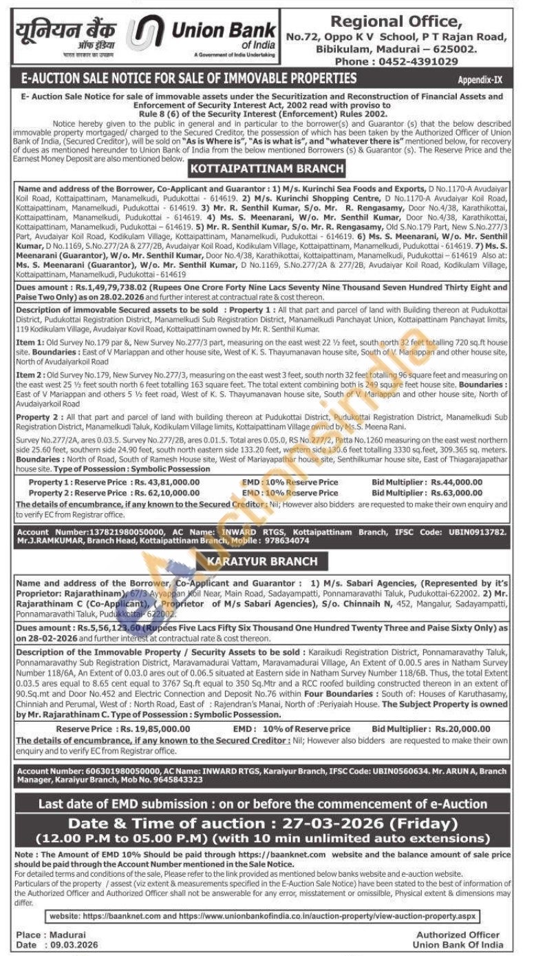 Description of immovable Secured assets to be sold Property 1: All that part and parcel of land with Building thereon at Pudukottai District, Pudukottai Registration District, Manamelkudi Sub Registration District, Manamelkudi Panchayat Union, Kottalpattinam Panchayat limits, 119 Kodikulam Village, Avudaiyar Kovil Road, Kottaipattinam owned by Mr. R. Senthil Kumar. Item 1: Old Survey No.179 par &, New Survey No.277/3 part, measuring on the east west 22 ½ feet, south north 32 feet totalling 720 sq.ft house site. Boundaries: East of V Mariappan and other house site, West of K. S. Thayumanavan house site, South of V. Mariappan and other house site, North of Avudaiyarkoil Road Item 2: Old Survey No. 179, New Survey No.277/3, measuring on the east west 3 feet, south north 32 feet totalling 96 square feet and measuring on the east west 25 V feet south north 6 feet totalling 163 square feet. The total extent combining both is 249 square feet house site. Boundaries: East of V Mariappan and others 5 ½ feet road, West of K. S. Thayumanavan house site, South of V. Mariappan and other house site, North of Avudaiyarkoil Road