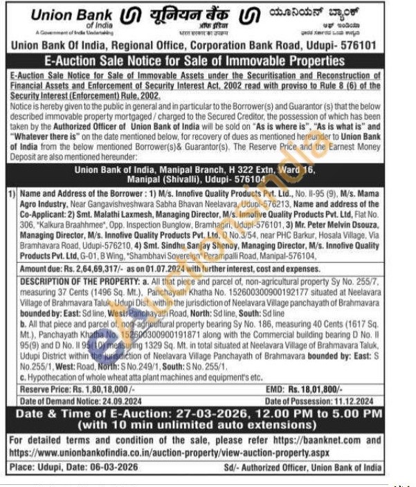 DESCRIPTION OF THE PROPERTY: a. All that piece and parcel of, non-agricultural property Sy No. 255/7, measuring 37 Cents (1496 Sq. Mt.). Panchayath Khatha No. 152600300900192177 situated at Neelavara Village of Brahmavara Taluk, Udupi Dist. within the jurisdiction of Neelavara Village panchayath of Brahmavara bounded by: East: Sd line, West: Panchayath Road, North: Sd line, South: Sd line b. All that piece and parcel of, non-agricultural property bearing Sy No. 186, measuring 40 Cents (1617 Sq. Mt.), Panchayath Khatha No. 152600300900191871 along with the Commercial building bearing D No. II 95(9) and D No. II 95(10) measuring 1329 Sq. Mt. in total situated at Neelavara Village of Brahmavara Taluk, Udupi District within the jurisdiction of Neelavara Village Panchayath of Brahmavara bounded by: East: S No.255/1, West: Road, North: S No.249/1, South: S No. 255/1. c. Hypothecation of whole wheat atta plant machines and equipment's etc.