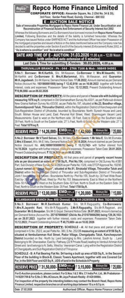 DESCRIPTION OF PROPERTY: All that piece and parcel of property vacant house site as per document an extent of 1750 Sq.ft., Plot No.154, comprised in Old Survey No 4/381 Part. Sub Division of New Survey No 4/2826 as per Patta No. 1329, vide DTCP Approval No. 192/90, Layout named as "Venus Nagar", situated at No.91, Sirukadal Village, Thiruvallur Taluk and District within the Registration District of Thiruvallur and Sub-Registration District of Thiruvallur Joint-1 bounded on the follows:-Boundaries North by-Plot No 155, South by-30 Feet Wide Road, East by-30 Feet Wide Road, West by- Plot No.153. Measurements: East to West on the Northem Side-50 Feet. East to West on the Southern Side-50 Feet, North to South on the Eastern Side-35 Feet. North to South on the Westem Side-35 Feel Total 1750 Sq.ft.
