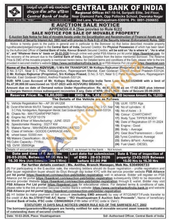 1) Vehicle Registration No-AP 39 VA1208 2) Owner of the Vehide Mis R.K. Transport, respresented by Mr. Kollapu Raj Kumar D No. 3-121, Near SC Peta, Kondagunturu, Rajanagaram Mandal, East Godavari District, Andhra Pradesh-533124 3) Chasis No: MA1TGARXFP6F74911 4) Engine No: PCPZF15179 5) Month & Year of Manufacturing: JUNE/2023 6) Speedometer Reading: 33217 KM 7) Makers Name: MAHINDRA & MAHINDRA LIMITED 8) Class of Vehicle:- GOODS CARRIAGE-HMV 9) wheel base: 53300 mm 10) Makers Classification:- BLAZ035TPBS653BG22B 11) Cubic Capacity:-7118cc 12) GVW: 35000Kgs 13) ULW: 13751 Kgs 14) No of cylinders: 6 15) No of Axles-3 16) Colour: C1ARTCWHIT 17) Body Type: TIPPER BODY 18) Date of Registration 07-11-2024 19) Engine:-Good 20) Body Average 21) Gear Box/Transmission-Good 22) Tyres Conditions: Average 23) Battery &Paint-Average 24) Fuel Used:- DIESEL
