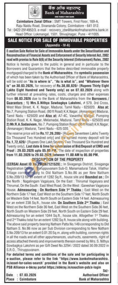 [CERSAI Asset ID No.200067121520]: In Sivaganga District, Sivaganga Registration District. Thiruppuvanam Sub-D, Manamadurai Taluk, Vilathur Village corresponding to Old Natham S.No.86 as per New Natham S.No.209/13 for an extent of 1282 Sq.ft., house site and Bounded on: On the North Nagalingam Vagaiyara, On the East: Thirumal Vagaiyara and Thirumal, On the South: East West Road, On the West: Ganeshan Vagaiyara House. Admeasuring: On Northern Side 1 Thakku: East West on the Northern Side 17 feet, East West on the Southern Side 17 feet, North South on Western Side 14 feet, North South on Eastern Side 14 feet. Admeasuring for an extent 238 Sq.ft., house site. On Southern Side 2 Thakku: East West on the Northern Side 36 feet, East West on the Southern Side 36 feet North South on Western Side 29 feet, North South on Eastern Side 29 feet. Admeasuring for an extent 1044 Sq. ft., house site. Altogether 1 Thakku and 2 Thakku total for an extent 1282 Sq. ft, house site along with building. The above said property bearing Natham Patta No. 149 corresponding to Old Natham S. No.86 now as per Sub Division corresponding to New Natham S.No.209/13 for an extent 0.01.20 Sq.m. along with building, common rights in all the roads and all other appurtenances, usufructs, easements, right of access attached thereto and improvements thereon owned by Mrs. S. Nithya Sowbagkya Lakshmi as per Gift Deed No.3294/2022 dated 30.09.2022 in S.R.O.. Thiruppuvanam.