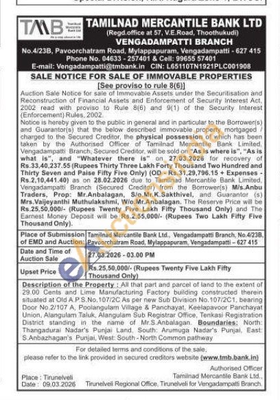Description of the Property: All that part and parcel of land to the extent of 29.00 Cents and Lime Manufacturing Factory building constructed therein situated at Old A.P. S.No. 107/20 As per new Sub Division No. 107/201, bearing Door No 2/107 A, Pociangulan Village & Panchayat, Keelapavoor Panchayat Union, Alangulam Taluk, Alangulam Sub Registrar Office. Tenkasi Registration District standing in the name of Mr.S.Anbalagan. Boundaries: North: Thangadurai Nadar's Punjai Land. South: Arumuga Nadar's Punjal, East: S Anbazhagan's Purnjai, West: South-North Common pathway