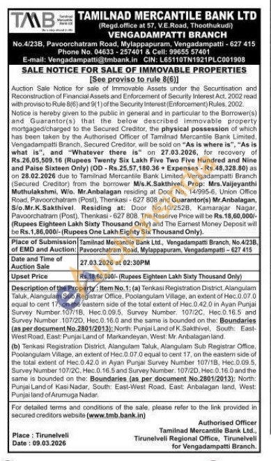 Description of the Property: Item No.1: (a) Tenkasi Registration District, Alangulam Taluk, Alangulam Sub Registrar Office, Poolangulam Village, an extent of Hec.0.07.0 equal to cent 17, on the eastern side of the total extent of Hec.0.42.0 in Ayan Punjai Survey Number. 107/18, Hec.0.09.5. Survey Number: 107/2C. Hec 0.16.5 and Survey Number 107/20, Hec.0.16.0 and the same is bounded on the: Boundaries (as per document No. 2801/2013): North Punjai Land of K. Sakthivel, South East-West Road, East: Punjai Land of Markandeyan, West: Mr. Anbalagan land
