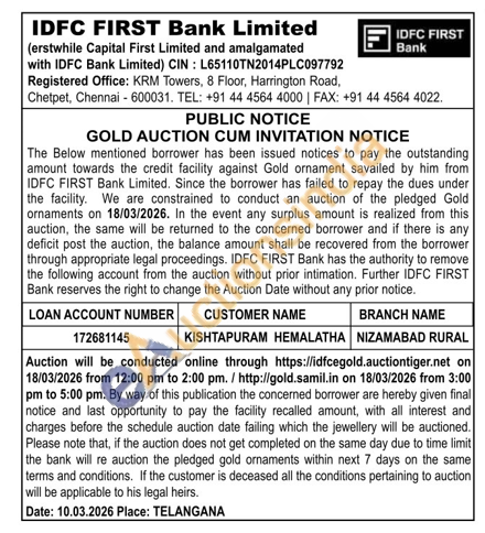 IDFC First Bank Ltd Gold Auctions Auction in Nizamabad