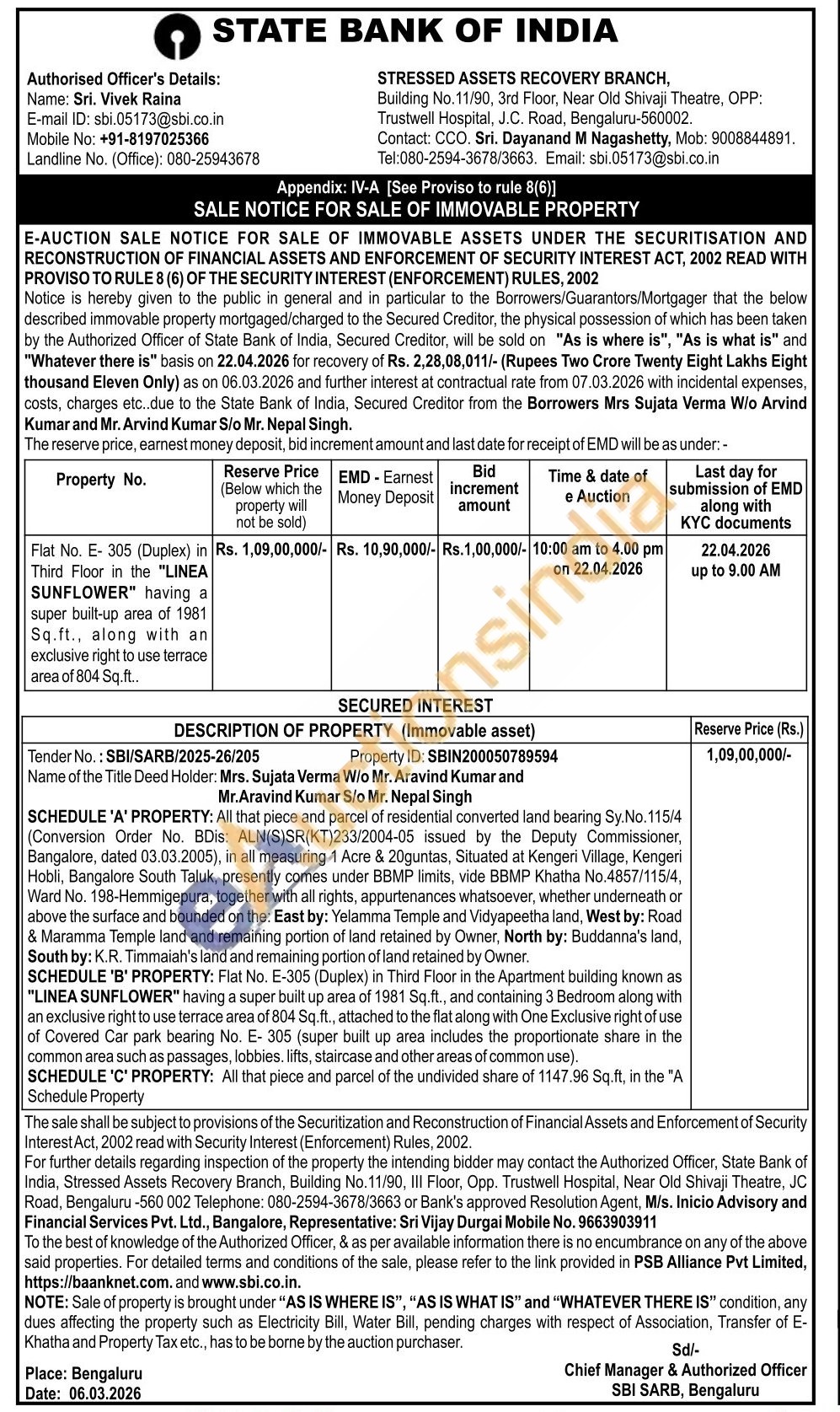 SCHEDULE 'A' PROPERTY: All that piece and parcel of residential converted land bearing Sy.No. 115/4 (Conversion Order No. BDis: ALN(S)SR(KT)233/2004-05 Issued by the Deputy Commissioner, Bangalore, dated 03.03.2005), in all measuring 1 Acre & 20guntas, Situated at Kengeri Village, Kengeri Hobli, Bangalore South Taluk, presently comes under BBMP limits, vide BBMP Khatha No.4857/115/4, Ward No. 198-Hemmigepura, together with all rights, appurtenances whatsoever, whether underneath or above the surface and bounded on the: East by: Yelamma Temple and Vidyapeetha land, West by: Road & Maramma Temple land and remaining portion of land retained by Owner, North by: Buddanna's land, South by: K.R. Timmaiah's land and remaining portion of land retained by Owner. SCHEDULE 'B' PROPERTY: Flat No. E-305 (Duplex) in Third Floor in the Apartment building known as "LINEA SUNFLOWER" having a super built up area of 1981 Sq.ft., and containing 3 Bedroom along with an exclusive right to use terrace area of 804 Sq.ft., attached to the flat along with One Exclusive right of use of Covered Car park bearing No. E-305 (super built up area includes the proportionate share in the common area such as passages, lobbies. lifts, staircase and other areas of common use). SCHEDULE 'C' PROPERTY: All that piece and parcel of the undivided share of 1147.96 Sq.ft, in the "A Schedule Property