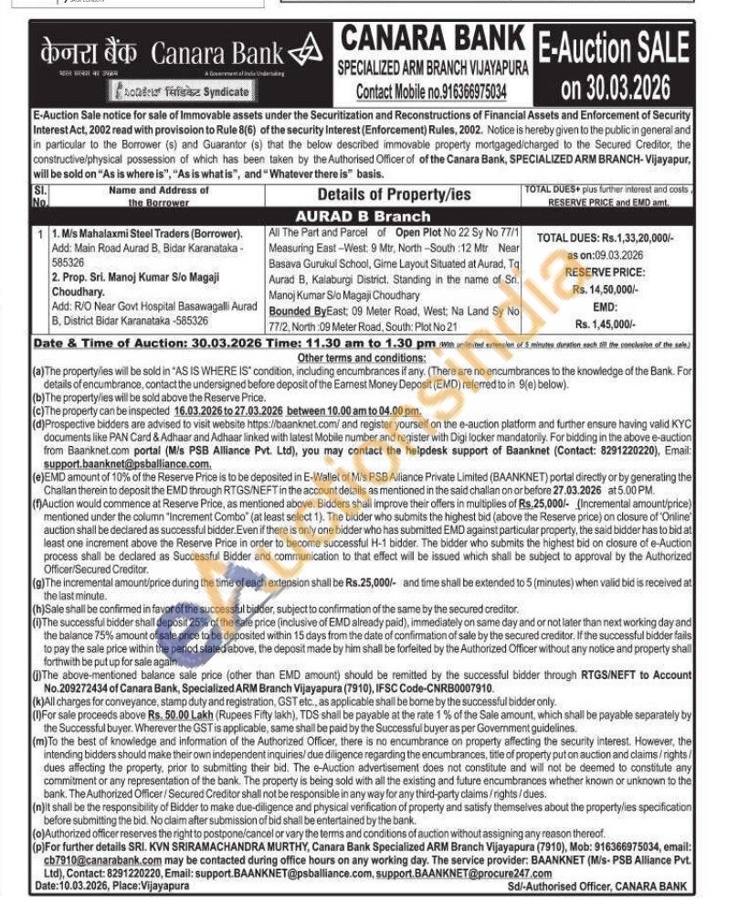 All The Part and Parcel of Open Plot No 22 Sy No 77/1 Measuring East-West: 9 Mtr, North-South 12 Mtr Near Basava Gurukul School, Girne Layout Situated at Aurad, Tq Aurad B, Kalaburgi District. Standing in the name of Sri. Manoj Kumar Sio Magaji Choudhary Bounded ByEast: 09 Meter Road, West; Na Land Sy no 77/2, North : 09 Meter Road, South: Plot No 21