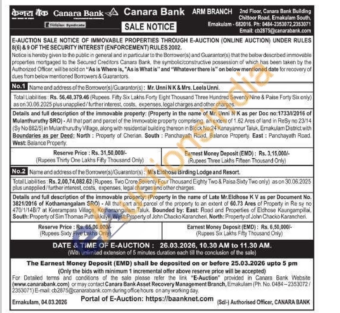 Details and full description of the immovable property: (Property in the name of Late Mr.Eldhose KV as per Document No. 3821/2016 of Kothamangalam SRO) All that part and parcel of the property to an extent of 60.73 Ares of Property in Re sy no 470/1/148/7 at Keerampara Village, Kothamangalam Taluk. Bounded by: East: Road and Properties of Eldhose Kaungampillai, South: Property of Sim Thomas Puthukkayil, West: Property of John Chacko Karancheri, North: Property of John Chacko Karancheri