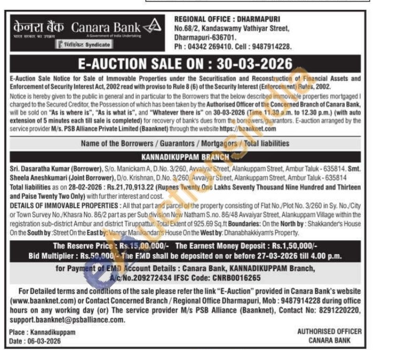 DETAILS OF IMMOVABLE PROPERTIES: All that part and parcel of the property consisting of Flat No./Plot No. 3/260 in Sy. No./City or Town Survey No./Khasra No. 86/2 part as per Sub division New Natham S.no. 86/48 Avvaiyar Street, Alankuppam Village within the registration sub-district Ambur and district Tiruppattur. Total Extent of 925.69 Sq.ft Boundaries: On the North by: Shakkander's House On the South by : Street On the East by: Vannar Manikandan's House On the West by: Dhanabhakkiyam's Property.