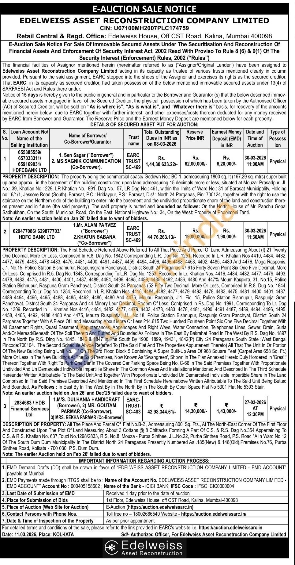 All The Piece And Parcel Of Flat No.B-2, Admeasuring 800 Sq. Fts., At The North-East Corner Of The First Floor And Constructed Upon The Plot Of Land Measuring About 3 Cottahs @ 8 Chittacks Forming A Part Of C.S. & R.S. Dag No.354 Appertaining To C.S. & R.S. Khatian No. 637, Touzi No. 1298/2833, R.S. No.8, Mouza - Purba Sinthee, J.L.No.22, Purba Sinthee Road, P.S. Road "A In Ward No.12 Of The South Dum Dum Municipality In The District North 24 Paraganas Presently Numbered As. 185 (New) & 146 (Old), Premises No.76, Purba Sinthee Road, Kolkata 700 030, P.S. Dum Dum